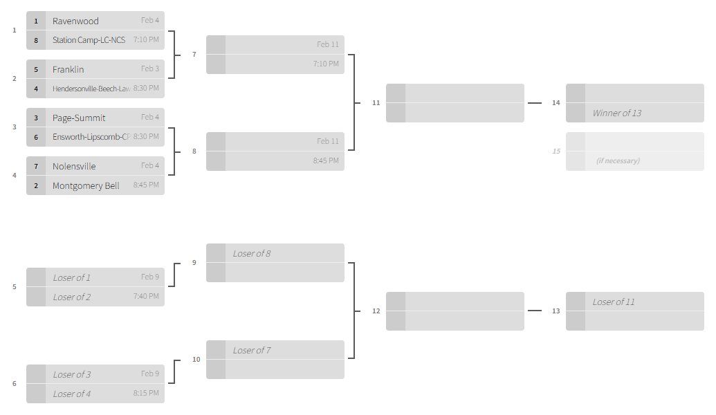 Station Camp-Liberty Creek-Nashville Christian: Tomorrow vs. 1 seed Ravenwood in a Predators Cup first round game @ 7:10 PM @ Centennial A