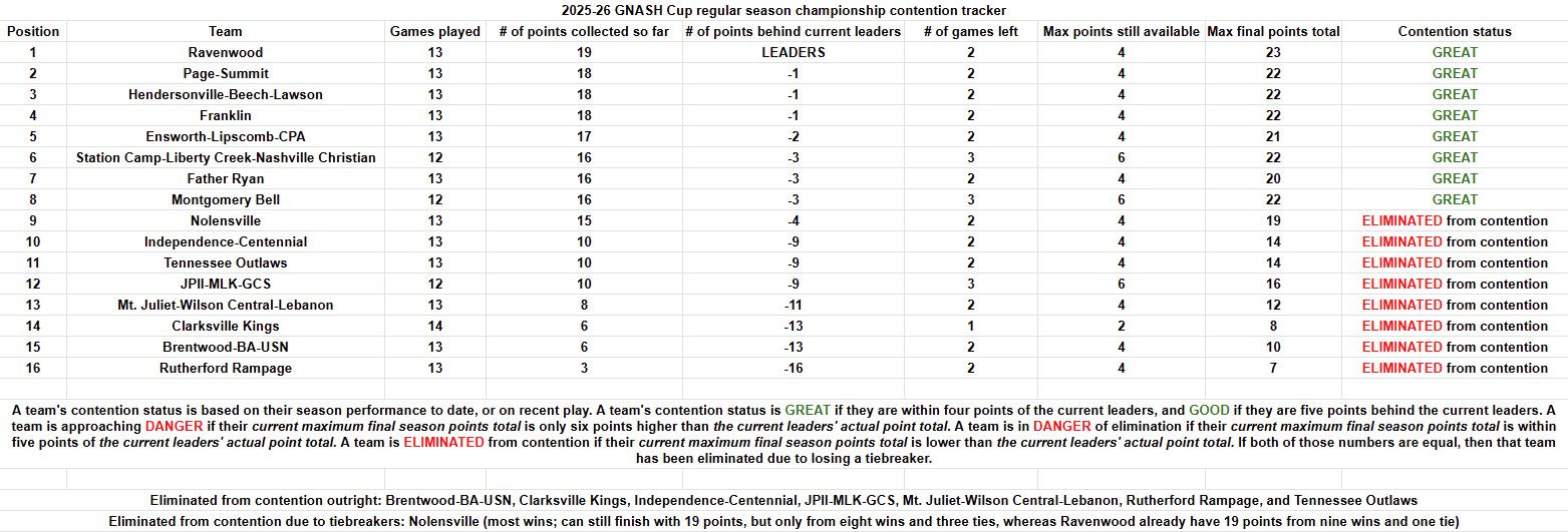 Caden Sisco scored the game’s first goal, when he took a shot from the bottom of the right circle in the Nolensville zone that appeared to go in off of Knights goalie Bingston Soundara. Just 71 seconds later, Spencer Kern carried the puck to the front of the Hendersonville net; it was poked off his stick, but came up the slot, where a trailing Emmett Szakos shot the puck over the left shoulder of Commandos netminder Griffen Rumbaugh into the back of the net. Just over six minutes later, Sisco was behind the Nolensville net, when his centering pass attempt was blocked and came back to him, so, he banked it in off of a prone Soundara. 61 seconds later, with the Knights on the power play, Jackson Malleus-Mayer caught up to a loose puck in the left circle, and fired it into the top left-hand corner. Just over four minutes later, Judah Campbell gave Nolensville their first lead of the game, when he took a shot from the top of the right circle that either bounced into the roof of the net on its own or deflected off of the stick of the Hendersonville defender who was backchecking. Either way, Nolensville led 3-2 after one. Nearly two minutes into the second, the Knights found themselves on the power play, and Malleus-Mayer scored a carbon copy of his first goal, and it was 4-2 Nolensville after two. Hendersonville won the faceoff to start the third, and Sisco completed his hat trick, firing it through the legs of Soundara from the high slot just nine seconds into the period. 9:02 later, Nicolas Hofmann scored the game’s final goal, nearly a carbon copy of Sisco’s first. The result of the game means that Nolensville are out of contention for the GNASH Cup regular season championship, and, more importantly, Ravenwood clinch the first Predators Cup berth, something I didn’t realize until after Hofmann’s goal, because Nolensville being knocked out of GNASH Cup contention meant that eight teams are now out, thus, the leaders - in this case, the Raptors - would clinch a Preds Cup berth. I can’t believe I didn’t catch that…but that wasn’t the only scenario I missed. See the Ensworth/Ravenwood recap below.
