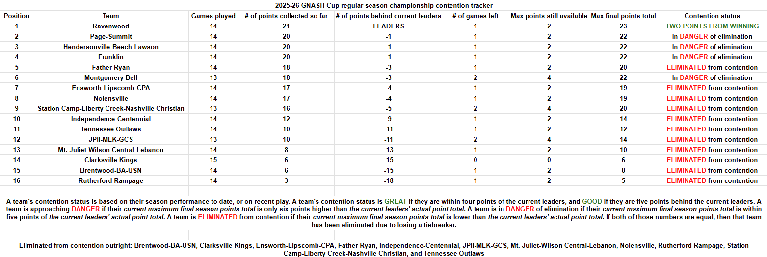I’m just going to do a generic recap instead of one with play-by-play since the game got so out of hand in the third (scoring-wise, anyway; there were a couple of tense moments, but nothing really bad in terms of fighting). Gage Hart scored four of the Irish’s goals, while Hudson Laux, Emma Causey, Brendan Malloy, and Sam Halloran also contributed to the final score, with Marek McCullars scoring a Game-Winning Senior Night Goal™ near the midway point of the first. Ryan are now just one point away from a Predators Cup berth, and can clinch it before taking on Hendersonville next Friday if Nolensville don’t beat JPII next Wednesday. Meanwhile, the Bears can still claim the Hine Cup 3 seed, but they have to win their regular season finale against MBA next Wednesday (not likely, I hate to say), and have JPII and the Outlaws lose their remaining games (JPII have two left, the Outlaws just one) to do so. Otherwise, they will be the Hine Cup 5 seed, as the two teams immediately behind them can’t surpass them: the Kings have completed the regular season, while Brentwood can still tie MJ on points, but can only finish with three wins, whereas the Bears already have four.