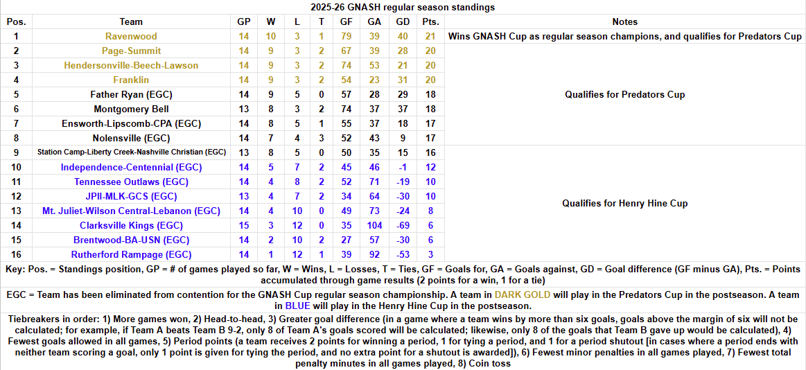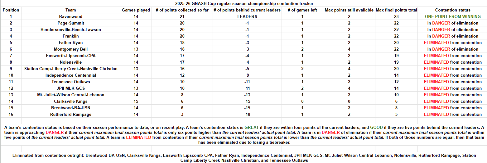 -Father Ryan, Montgomery Bell, AND Ensworth-Lipscomb-CPA would ALL clinch Predators Cup berths, leaving just one berth remaining, which Station Camp-Liberty Creek-Nashville Christian would then clinch if they DEFEAT OR TIE WITH Ravenwood, meaning that there would be no Preds Cup berths left, giving Nolensville the final Henry Hine Cup spot, and therefore, BOTH POSTSEASON TOURNAMENT FIELDS WOULD BE COMPLETELY FILLED.