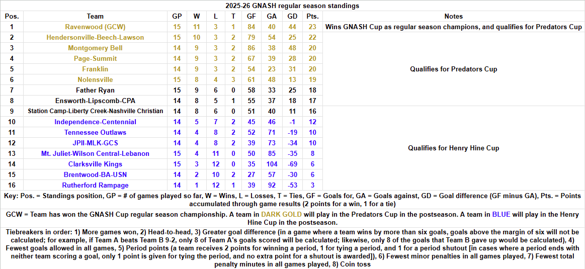 MBA have won five games by a margin bigger than six goals this season: 9-1 against the Outlaws on September 22; 9-2 against the Rampage on November 10; 13-3 against JPII on December 1; 8-0 against the Kings on December 8; and 12-1 against Mt. Juliet-Wilson Central-Lebanon on January 21. You take away two goals scored against the Outlaws, one scored against the Rampage, four scored against JPII, two scored against the Kings, and five scored against Mt. Juliet. That’s 14 goals scored taken away for goal differential, bringing their goals scored down from 86 to 72. The Big Red have lost three games, all within a margin of six goals, so all of the 38 goals that they have allowed are counted, bringing their current goal differential in accordance with GNASH rules to +34. Hendersonville, meanwhile, have only won one game by a margin bigger than six goals, their 11-4 win over the Outlaws on December 3, meaning their goals scored only goes down from 79 to 78. They have not lost a game by a margin bigger than six goals, meaning that all 54 goals they’ve allowed are counted, bringing their final tiebreaker GD to +24. Page’s recent 11-0 win over the Kings on January 14 is the only game they’ve won by a margin bigger than six, so, their goals scored goes from 67 down to 62. And, like the Big Red and Commandos, they haven’t lost a game by more than six, so, all 39 goals they’ve allowed are counted, bringing their current tiebreaker GD to +23.